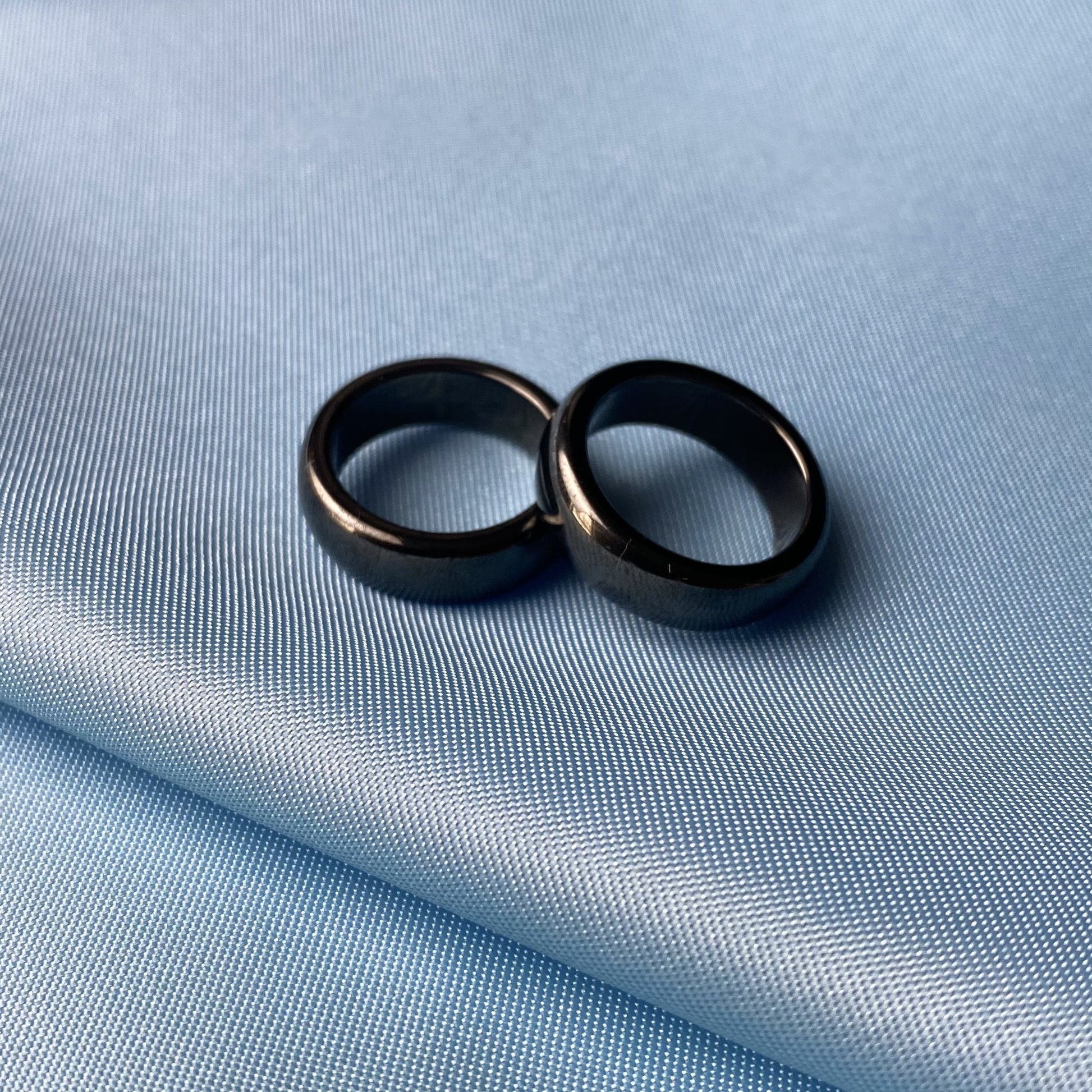 Anello fascia in ematite naturale. Larghezza 6 mm. Varie misure disponibili. Colore nero con bordature argentate.