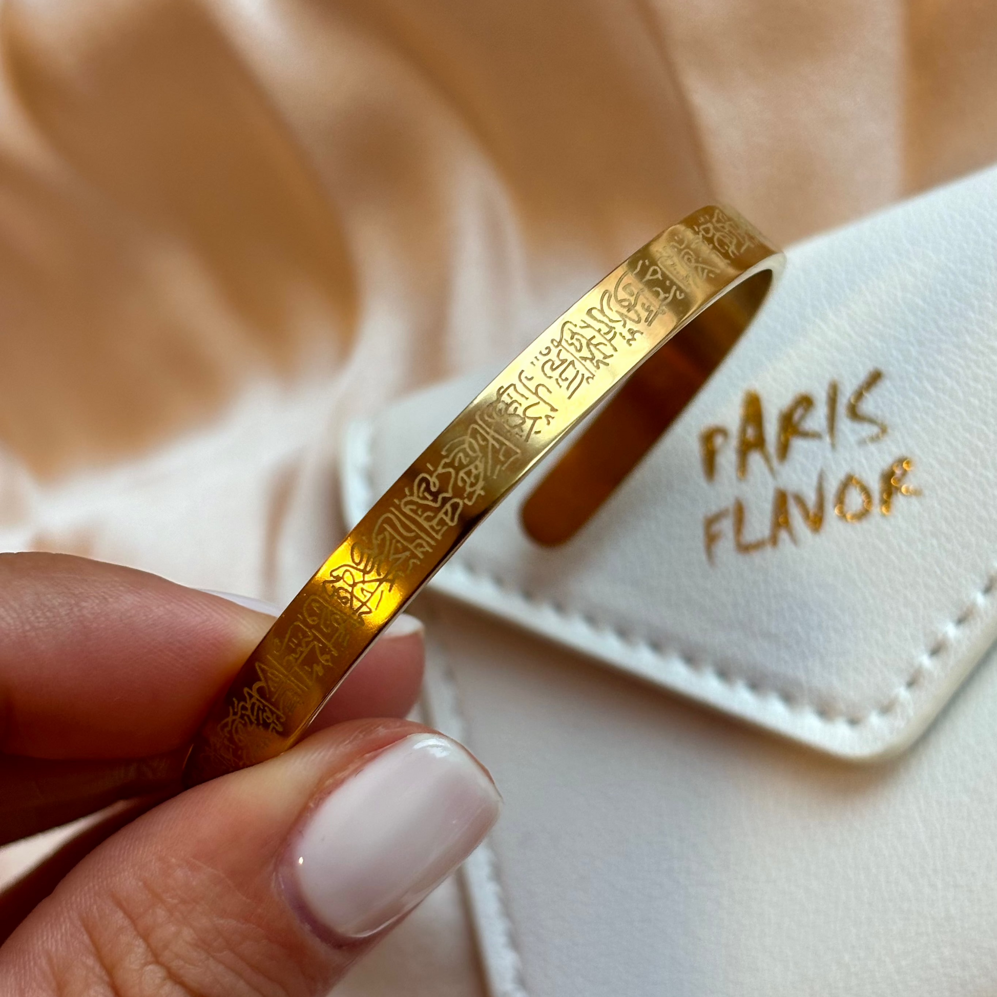 Questo elegante bracciale è inciso con l'Ayat al-Kursi, il Versetto del Trono nell'Islam, simbolo di protezione e benedizione. Realizzato con cura, è perfetto per i credenti che cercano serenità e felicità nella loro vita quotidiana. Un potente promemoria della fede in Allah e della Sua eterna protezione.