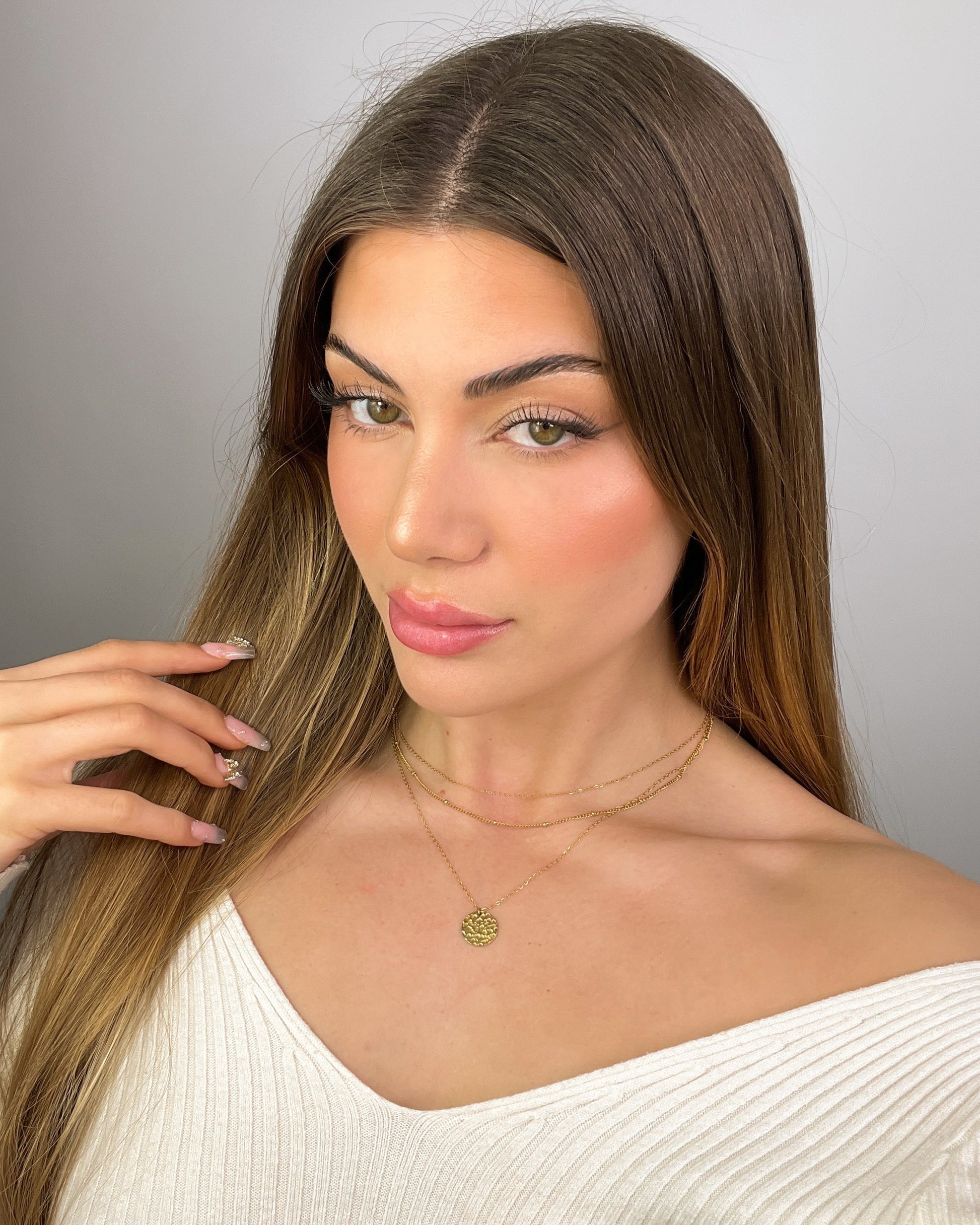 Aggiungi un tocco di serenità con il set di collane multifilo Serenity con finitura oro. Questo grazioso set multifilo è composto da due collane choker e una collana con pendente a medaglione circolare trapuntato.